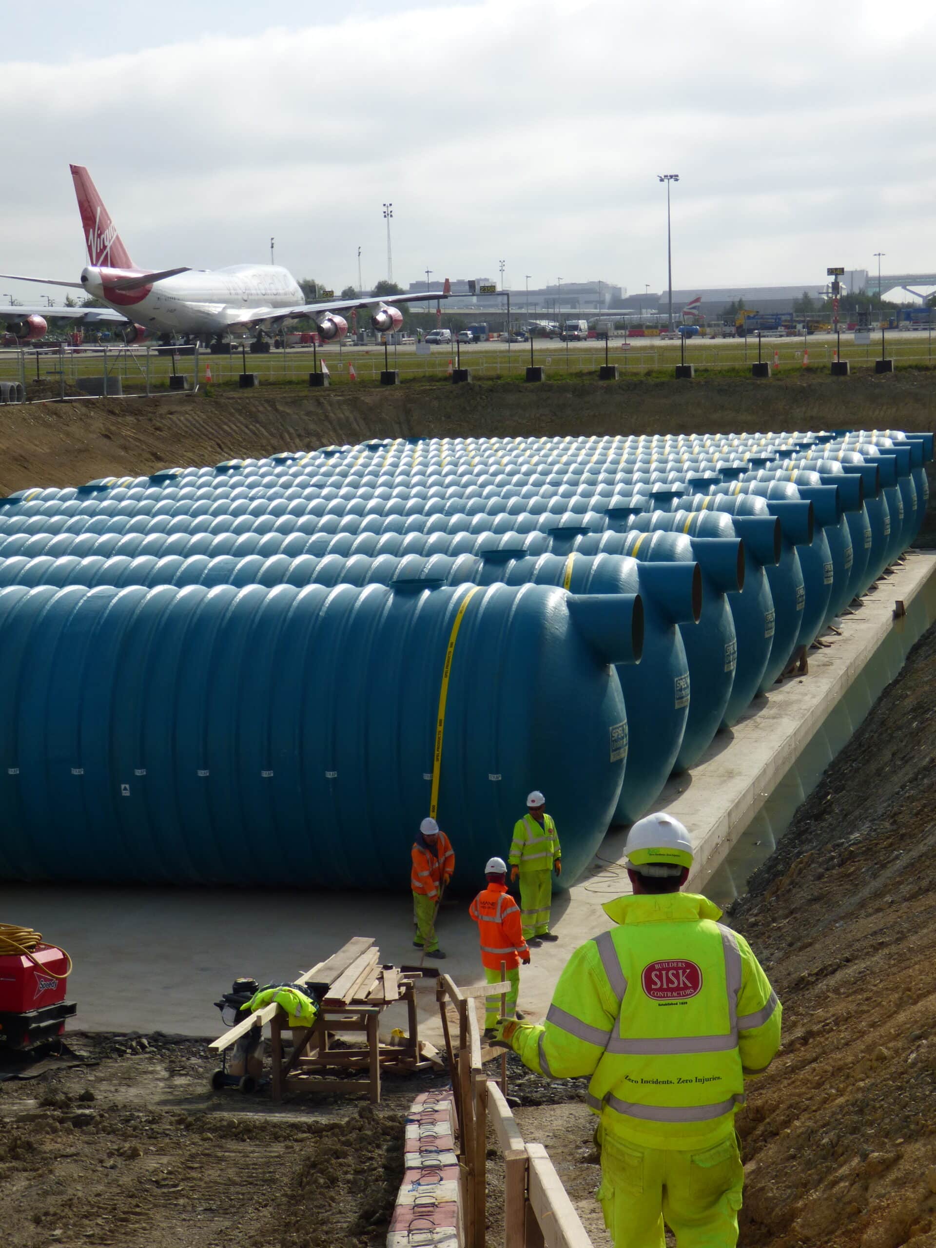Due to the many potentially flammable activities being undertaken and materials stored within the new hangar, a huge fire suppression system consisting of a foam dispensing sprinkler system. This firefighting foam could not be released into the environment due to the potentially harmful contaminants that may get picked up and because of the chemicals within the foam itself. The flow rate of the sprinkler system was vast and therefore over 3 million litres of capacity was required to store all of the foam in the case of a catastrophic fire.